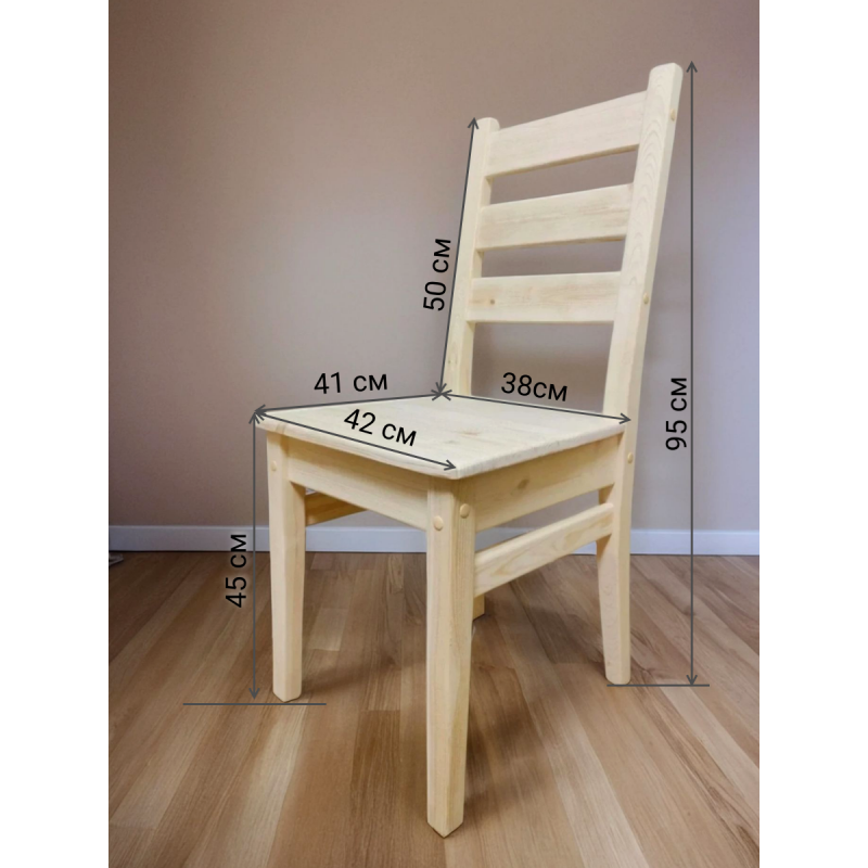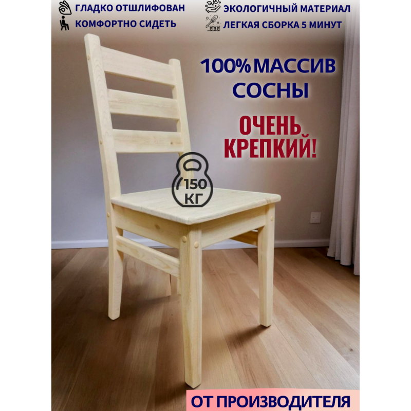 Стулья деревянные изготовлены из 100% массива сосны, очень прочные, выдерживают вес до 150кг. Гладко отшлифованы. ОТ ПРОИЗВОДИТЕЛЯ. Производство Московская область, г. Химки. Гарантия 10 лет. Вы можете быть уверены в их экологичности и безопасности, так как они соответствуют европейскому стандарту EN71.