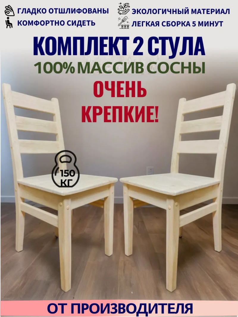 Стулья деревянные изготовлены из 100% массива сосны, очень прочные, выдерживают вес до 150кг. Гладко отшлифованы. ОТ ПРОИЗВОДИТЕЛЯ. Производство Московская область, г. Химки. Гарантия 10 лет. Вы можете быть уверены в их экологичности и безопасности, так как они соответствуют европейскому стандарту EN71.