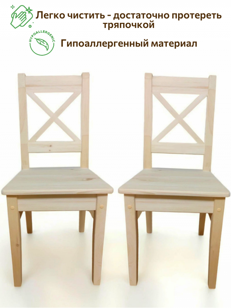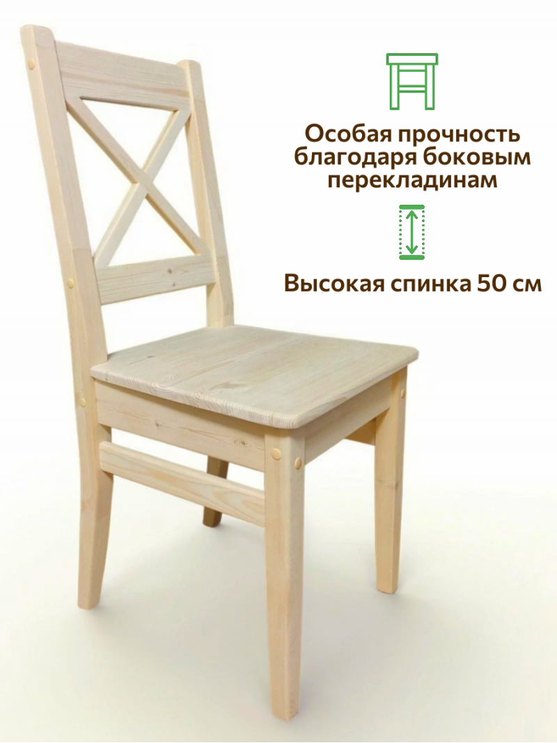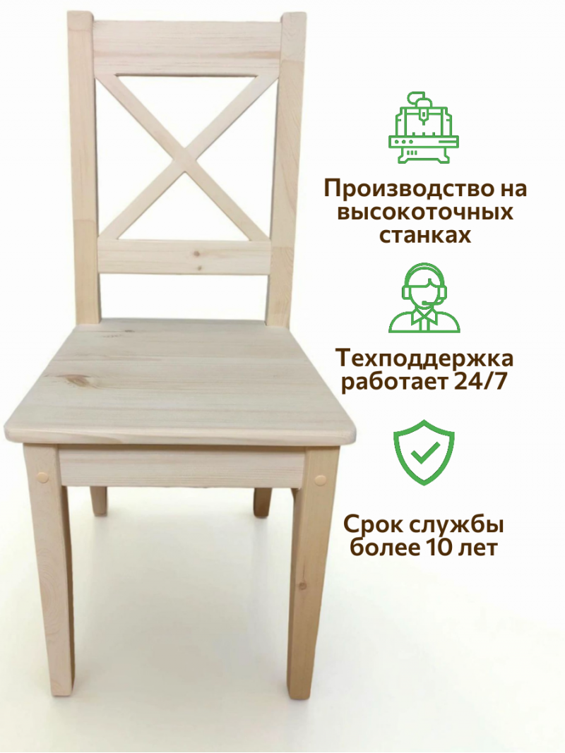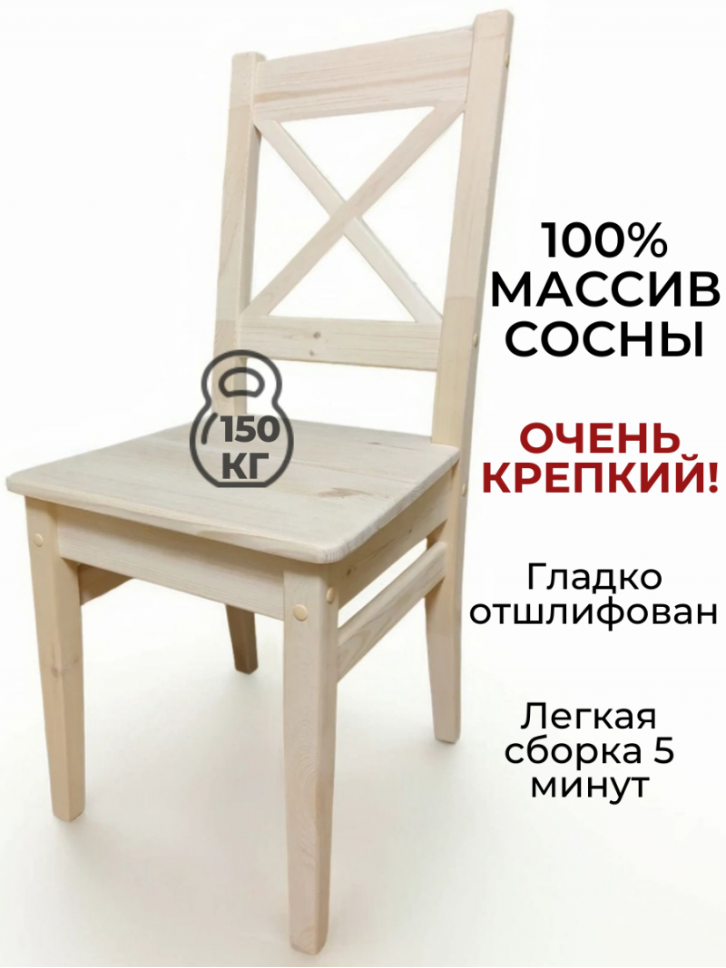 Стулья деревянные изготовлены из 100% массива сосны, очень прочные, выдерживают вес до 150кг. Гладко отшлифованы. ОТ ПРОИЗВОДИТЕЛЯ. Производство Московская область, г. Химки. Гарантия 10 лет. Вы можете быть уверены в их экологичности и безопасности, так как они соответствуют европейскому стандарту EN71.