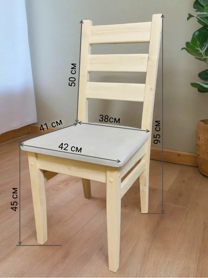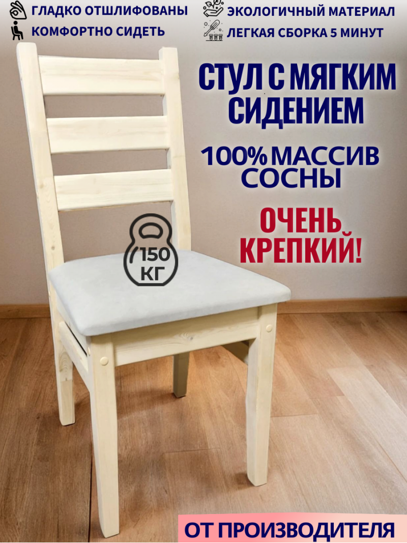 Наши деревянные стулья из натурального дерева с мягким сиденьем - лучший выбор в соотношении цена/качество! Стулья изготовлены из 100% массива сосны, очень прочные, выдерживают вес до 150кг. Материал обивки - натуральный велюр. Гладко отшлифованы. ОТ ПРОИЗВОДИТЕЛЯ. Производство Московская область, г. Химки. Гарантия 10 лет. Вы можете быть уверены в их экологичности и безопасности, так как они соответствуют европейскому стандарту EN71.